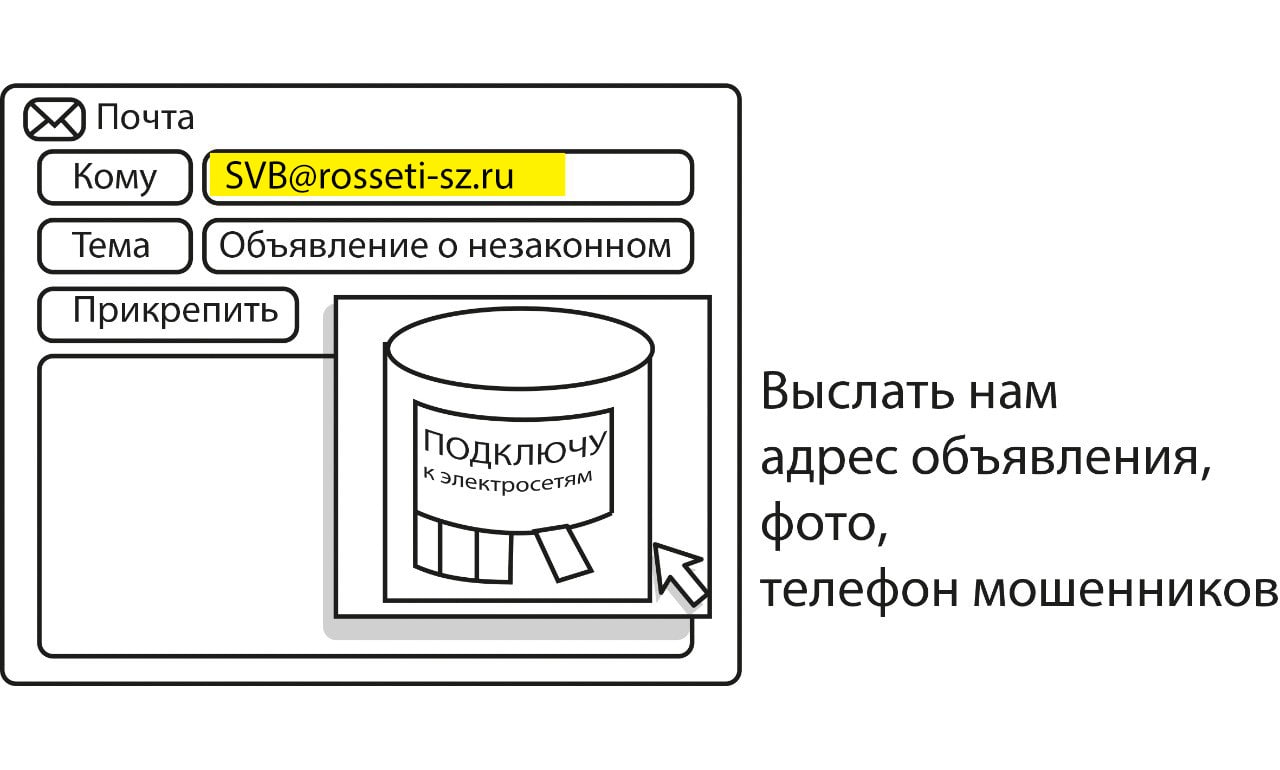 форму обратной связи https://clients.rosseti-sz.ru/feedbackpage/sendfeedback/, выбрав «Классификация» > «Сообщить о нарушении». Укажите в тексте предмет объявления, адрес, по которому оно размещено, контактный номер телефона мошенников, по возможности загрузите фотографию объявления в Прилагаемые материалы и документы.